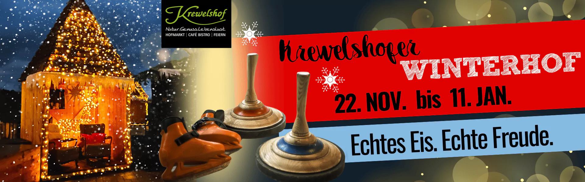 Der Winterzauber ist unser Veranstaltungsprogramm während der Winterzeit auf unserem Winterhof, mit Fotopoints und Treff an der Glühwein-Hütte, mit Kinderwünsche-Sternen am Krewelshofer Weihnachtsbaum, mit naturbelassenen od. wahlweise geschulten himmlischen Tannenbäumen, mit Erwachsenen-Workshops wie Adventskranz binden und gestalten, mit Kerzenschein, viel Lichterglanz oder Glphwein-Treff am Lagerfeuer. DO bis SO geht’s ab zur Eisbahn, mit Eisstockschiessen, das ist unser Weihnachten wie früher auf dem Lande (Tipp: zuzüglich Nagelbalken, Hau-den-Lukas und den kleinen Krewelshofer Naschmarkt für Eure Weihnachtsfeier buchen).
